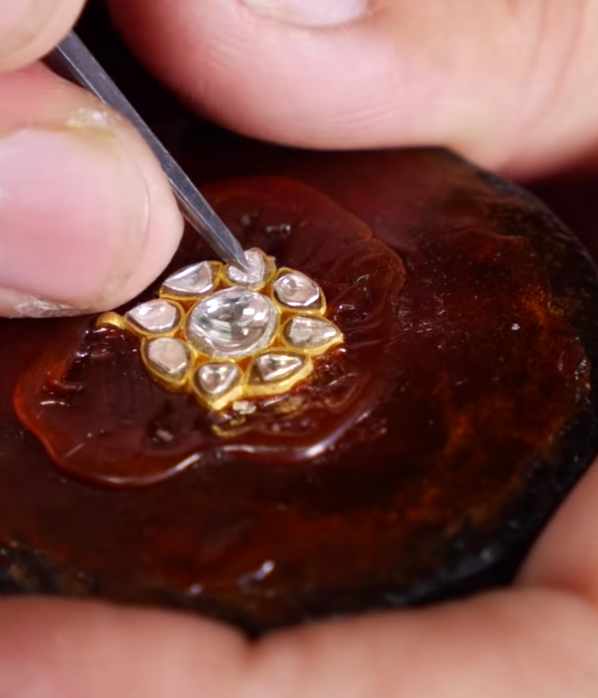 All the stones are hand picked by our gemologists and are set in Kundan, which is a traditional form of Indian gemstone setting involving a gem set with a gold foil between the stones and its mount. The method is believed to have originated in the royal courts of Rajasthan and Gujarat. It is one of the older forms of jewelry made and worn in India