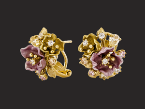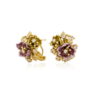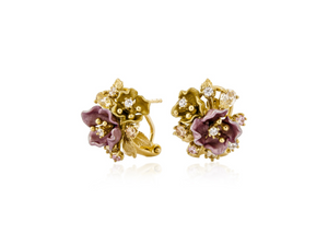 These elegant amethyst and gold floral cluster earrings feature a beautiful arrangement of enameled flowers in shades of amethyst and gold, accented with sparkling crystals on a gold-toned stud. A unique and sophisticated design that captures the beauty of a blooming garden.