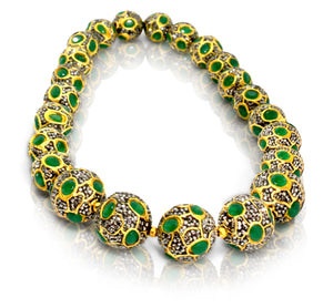 This majestic emerald necklace features emerald and marcasites and uses 24kt gold foil and wax to bring you a statement piece that fits almost all occasions. Whether you wear it with your short black dress or pair it with your traditional attire, you simply can’t go wrong with this contemporary emerald necklace.