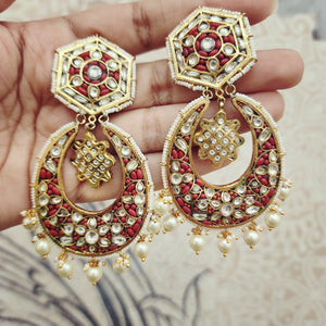 Beautiful gold foil Coral & Flower Kundan Chandbali earrings with delicate pearl drops. The intricate design showcases a blend of rich coral stones and classic Kundan work, making these earrings a perfect addition to any traditional ensemble.