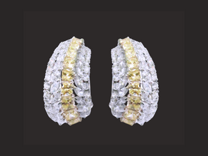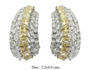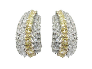 Make a bold and stylish statement with these curved white and cannary CZ cluster earrings. Featuring a unique half-hoop design adorned with a dazzling arrangement of both white and cannary cubic zirconia stones, these earrings offer exceptional sparkle and modern elegance.