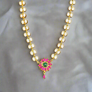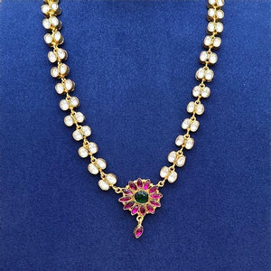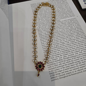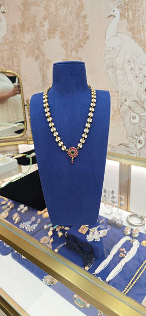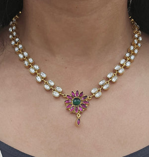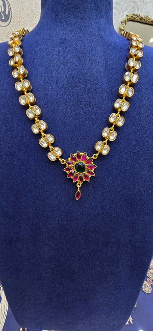 Discover the exquisite beauty of our Delicate Kundan Necklace, featuring a radiant floral pendant adorned with ruby petals and a green emerald center. Each element is meticulously set amidst sparkling kundan stones,Strung on a chain of golden kundan links, this necklace is perfect for adding a touch of regal elegance to any ensemble, making it ideal for weddings, celebrations, or as a cherished gift.