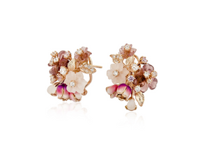 These enchanting dusky bloom floral cluster earrings feature a beautiful arrangement of enamel flowers in soft shades of pink and purple, accented with sparkling crystals on a rose gold-toned stud. A unique and elegant design that brings a touch of romantic beauty to any occasion.