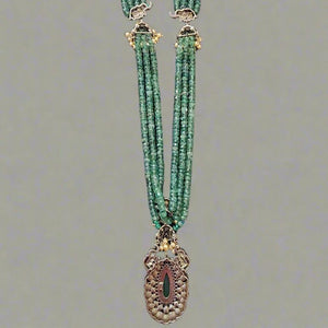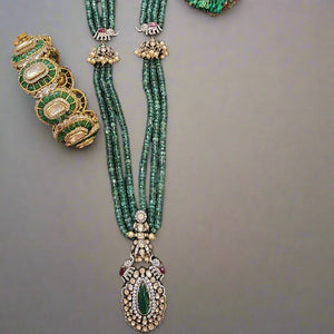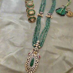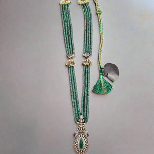 This elegant necklace features four strands of natural russian quartz, stringed with gold-toned elephant embellishments and a detailed pendant. The pendant showcases a striking central green stone, surrounded by CZ and polkis, creating a timeless, luxurious look. Perfect for traditional events, this piece exudes sophistication and adds a refined touch to any ensemble.