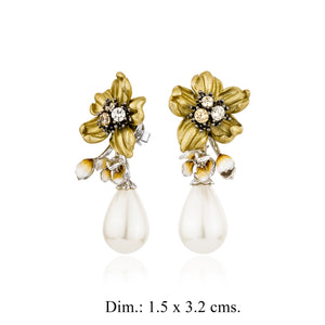These elegant golden bloom pearl drop earrings feature stylized metallic gold flowers with sparkling crystal centers, suspending a luminous ivory pearl. A unique and sophisticated design that adds a touch of floral beauty to any occasion.