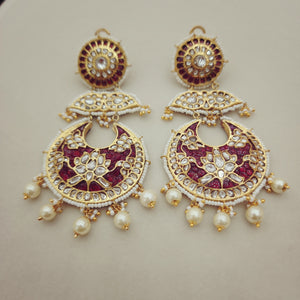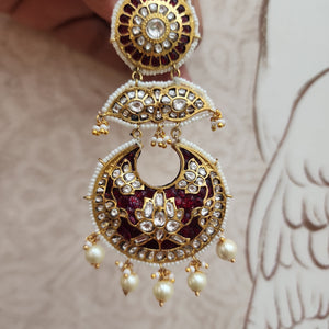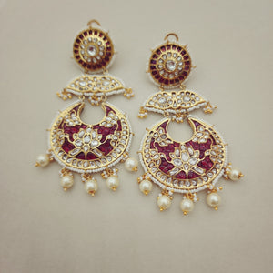 Adorn your ears with the timeless elegance of Kundan & Ruby Chandbali Earrings. Crafted with kundan work, these gold foil earrings feature a beautiful blend of rubies and pearls, creating a stunning crescent design that adds a touch of royalty to any ensemble. Perfect for weddings and special occasions.