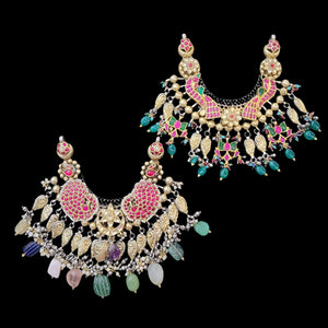 A Fusion pendant with intricate floral kundan designs, highlighted by two majestic peacocks on each side. Adorned with gold ball detailing along the bottom, the pendant features pink and green kundan lotus motifs and elegant blue bead drops. A perfect blend of tradition and modern artistry, this two-hook pendant adds a regal touch to any look.