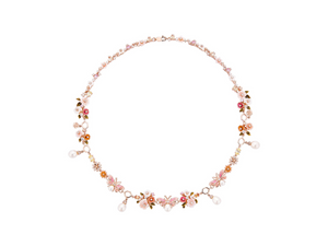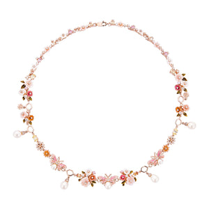 This exquisite rose gold statement necklace features a delicate and intricate design of enameled flowers and butterflies in soft pastel hues, interspersed with sparkling crystals and elegant dangling pearls. A unique and enchanting piece inspired by a blossoming garden, perfect for adding a touch of whimsical elegance to any special occasion.