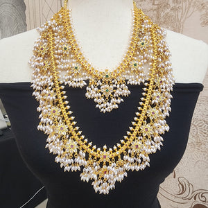 Embrace timeless elegance with this Short Gutta Pusalu Necklace, featuring intricate pearl details on a gold-plated base with sparkling gems. Perfect for bridal or special occasions, it beautifully combines traditional charm with contemporary allure.