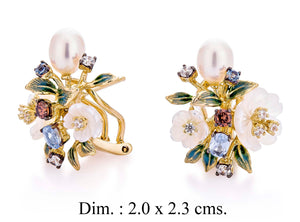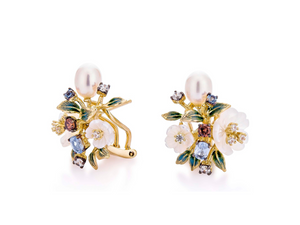 These elegant floral pearl drop earrings feature a beautiful cluster of enameled flowers, sparkling multicolored gems, and a luminous pearl gracefully dangling below a gold-toned stud. A unique and sophisticated design inspired by a blooming garden.